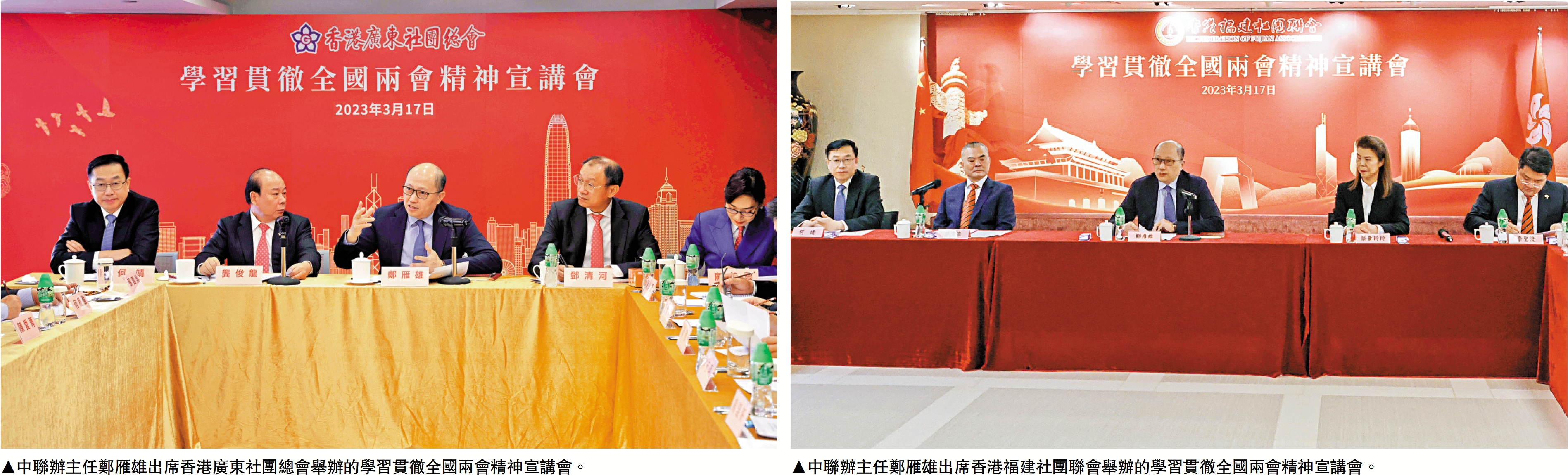 【大公報訊】3月17日,香港廣東社團總會和香港福建社團聯會分別舉行「學習貫徹全國兩會精神宣講會」。中央政府駐港聯絡辦主任鄭雁雄應邀出席並作交流分享。香港廣東社團總會主席龔俊龍、香港福建社團聯會主席施清流分別主持宣講會,中聯辦副主任何靖以及近60名同鄉社團骨幹、基層代表參加。