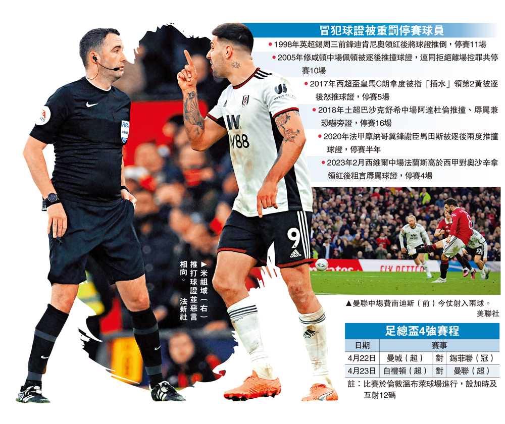 富咸「自爆40秒」,下半場短時間內先後有領隊馬高施華、中場韋利安與射手阿歷山大米祖域領紅被逐,讓表現不濟的「紅魔鬼」曼聯在最後15分鐘扭轉乾坤,結果在英格蘭足總盃8強主場以3:1反勝晉級4強,下月將與白禮頓爭入決賽;其中一名被逐者、替富咸先拔頭籌的米祖域,是因不滿球證判決,一時失去冷靜之下推打球證而被逐,恐怕會在自動停賽3場之上被進一步「加刑」,富咸今回可謂賠了夫人又折兵。\大公報記者 譚德龍
