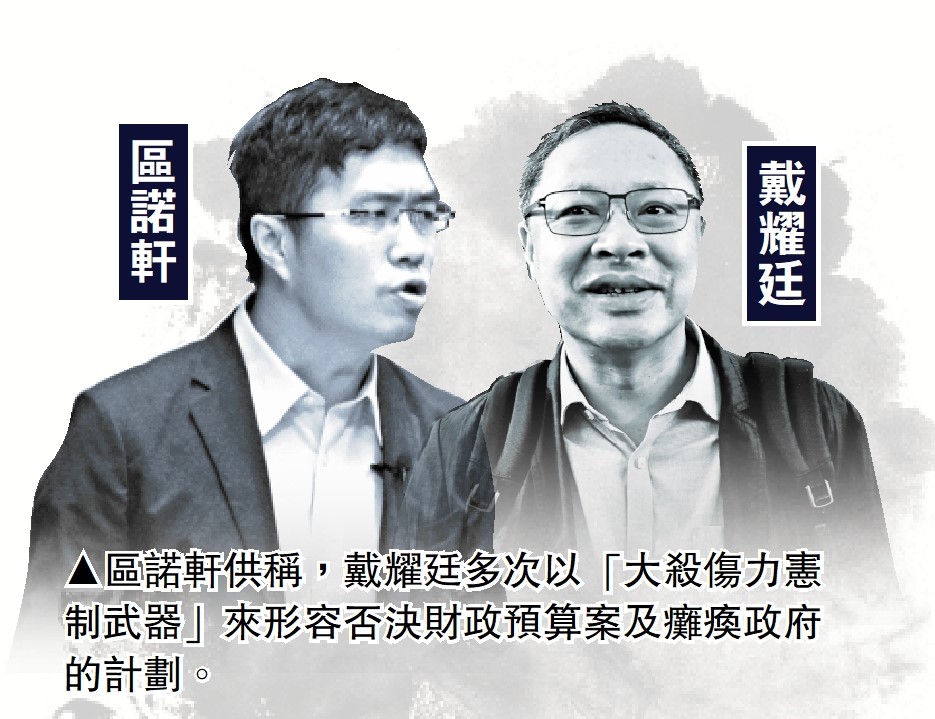 法官陳慶偉關注,戴耀廷曾以「大殺傷力憲制武器」形容立會議員行使預算案否決權,戴耀廷提出這個字眼,源於逾20年前的伊拉克戰爭,美國以「大殺傷力武器」為由攻打伊拉克,推翻當地政權。區諾軒就此表示,沒有想到法官所述的歷史背景,自己視之為戴耀廷「對於基本法憲制權力的論述框架,對於使用呢種權力的一種包裝」。