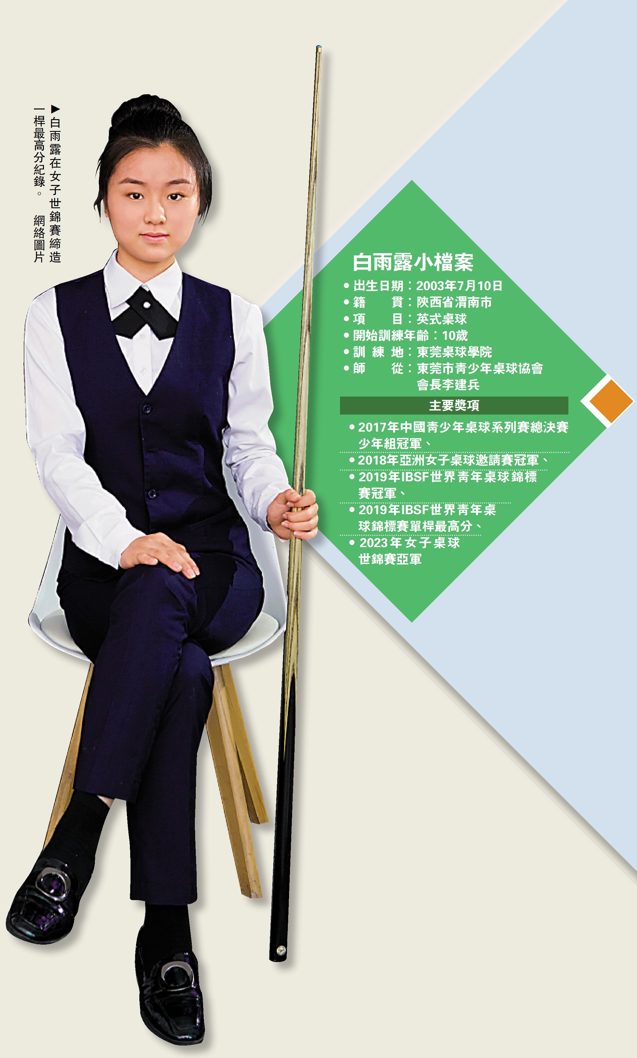 現年19歲的中國女子桌球手白雨露,今年3月首次征戰女子世錦賽便大放異彩,不僅打破塵封20年的史上一桿最高紀錄,最終亦勇奪亞軍。其實,她曾在2018年的亞洲女子桌球邀請賽擊敗當時的「一姐」吳安儀奪冠,過去多年也在中國職業桌球巡迴賽與內地男子選手對陣。自10歲刻苦訓練的她志向遠大,希望成為首個在Q School贏得桌球職業賽資格的女球手,繼而在職業賽與世界級球手爭鋒,成為真正的「桌球女王」。\ 大公報記者 梁潤森