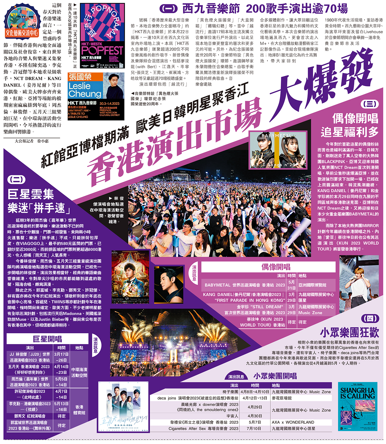 這個春天對於香港樂迷而言,一定是一個豐盛的季節。伴隨香港與內地全面通關以及社會復常,來自世界各地的音樂人與樂迷又集聚香港,不僅有陳奕迅、李克勤、許冠傑等本地重量級歌手,NCT DREAM、KANG DANIEL(姜丹尼爾)等日韓偶像、歐美大牌亦齊齊來港,紅館、亞博等場館的檔期密密麻麻排到年底;周杰倫、林俊傑、五月天三組樂壇巨星,在中環海濱活動空間開唱,令耳熟能詳的流行樂曲回響維港。\&大公報記者 徐小惠
