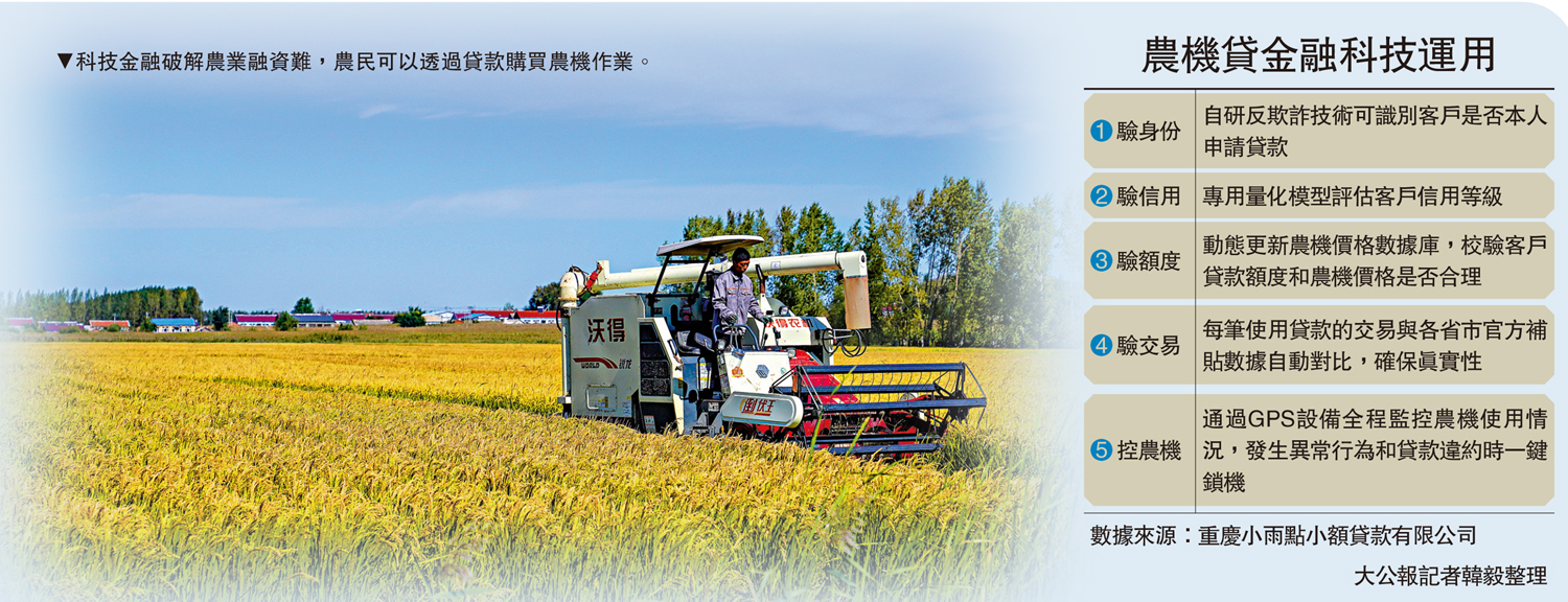 恒基地產(00012)創辦人李兆基家族在重慶投資開設的科技驅動小貸公司──重慶小雨點小額貸款公司,為解決農村融資難融資慢等問題,在2019年為農機手、種植戶量身「農機貸」,創新純線上、無抵押的「科技金融富農」模式。農戶通過手機應用程式即可在線自主申請貸款用於購買農機,從申請到放款最快僅需10分鐘。截至2022年底,其農機貸產品已為全國逾萬種植戶提供超過10億元貸款,支持農機手超過13000人,目前已盈利數千萬元。