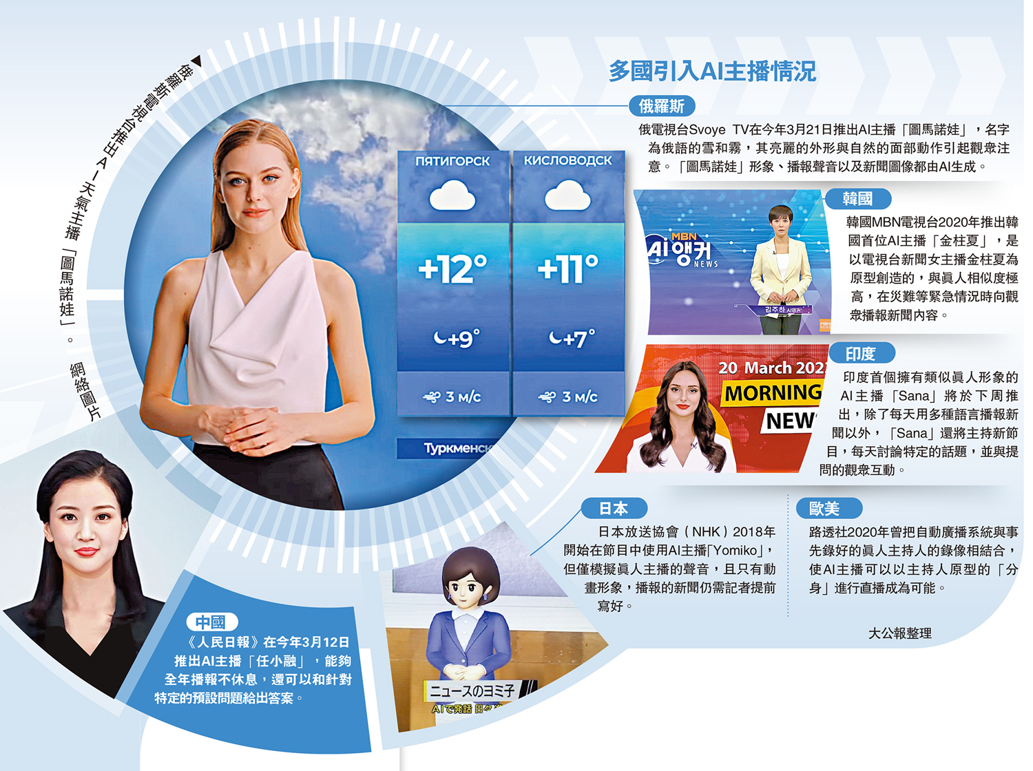 【大公報訊】綜合BBC、《商業內幕》報道:近年人工智能(AI)發展蓬勃,已廣泛應用於綜藝、遊戲等眾多場景,不少新聞機構也陸續推出AI主播。俄羅斯電視台Svoye TV周二推出了AI天氣主播「圖馬諾娃」,節目的內容和圖像都是AI自動生成。據介紹,這一靈感來自中國媒體推出的AI主播。不過,該電視台表示目前未有打算放棄採用人類主播。雖然人類主播記者仍然堅守新聞陣地,但AI主持人和聊天機器人ChatGPT的出現,標誌着未來新聞生產和播放的方式都可能發生轉變。