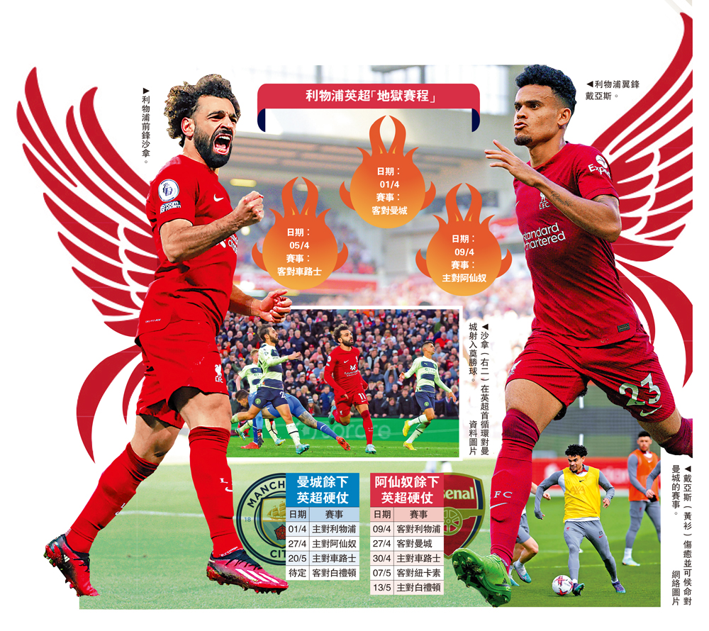 在英國兩項盃賽及歐聯相繼出局後,利物浦只餘下保住聯賽前4名這個目標,若連這個亦失敗今季肯定是個災難球季,偏偏除了目前形勢已不妙之外,今天起更要經歷英超「死亡9日」地獄賽程,今晚早場先鬥曼城,然後再火併車路士與阿仙奴3大強敵,不幸全敗便可提早宣布「災難已來臨」。為免掉進深淵,球隊只好寄望近季面對上述幾隊時屢有佳作的右翼穆罕默德沙拿,以及終於傷癒復出的左翼路爾斯戴亞斯,雙雙拍翼讓紅鶴高飛。\大公報記者 譚德龍
