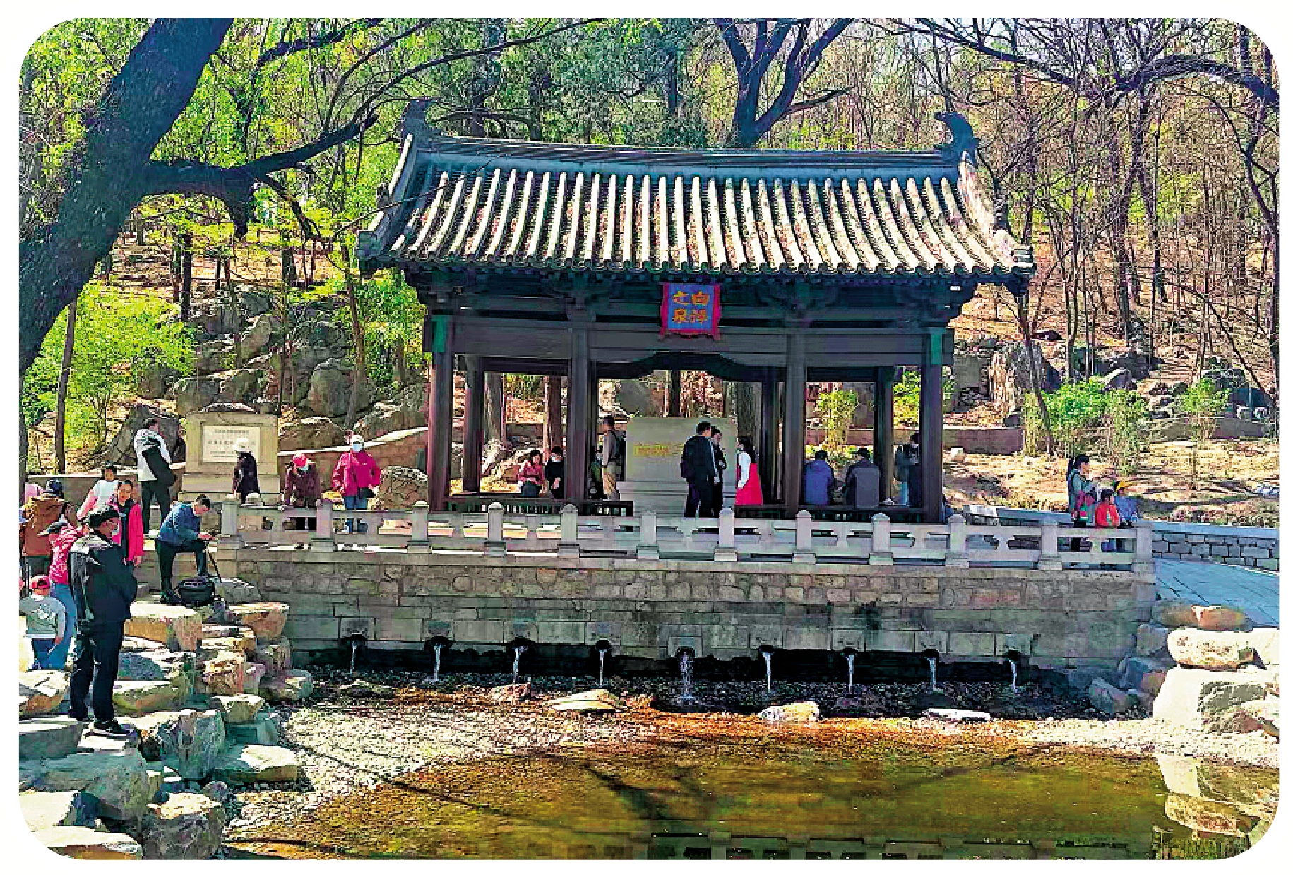 大運河源頭遺址公園的標誌性景點九龍池坐落在龍山北側山腳。池邊九個龍頭鬚髮皆現,維妙維肖,龍頭自石壁內向外探出,水流噴湧而出,再匯聚於深潭,在春日裏波光瀲灧。葉建偉介紹說,九龍池的池壁以花崗岩石砌成,龍首均為漢白玉石雕成後嵌入石壁,因水流出處有九個龍頭,取名九龍池,又有「九龍戲水」「九龍噴玉」之稱。如今,白浮泉已恢復了汩汩流淌,當年700年前「龍泉漱玉」的盛景得以重現。