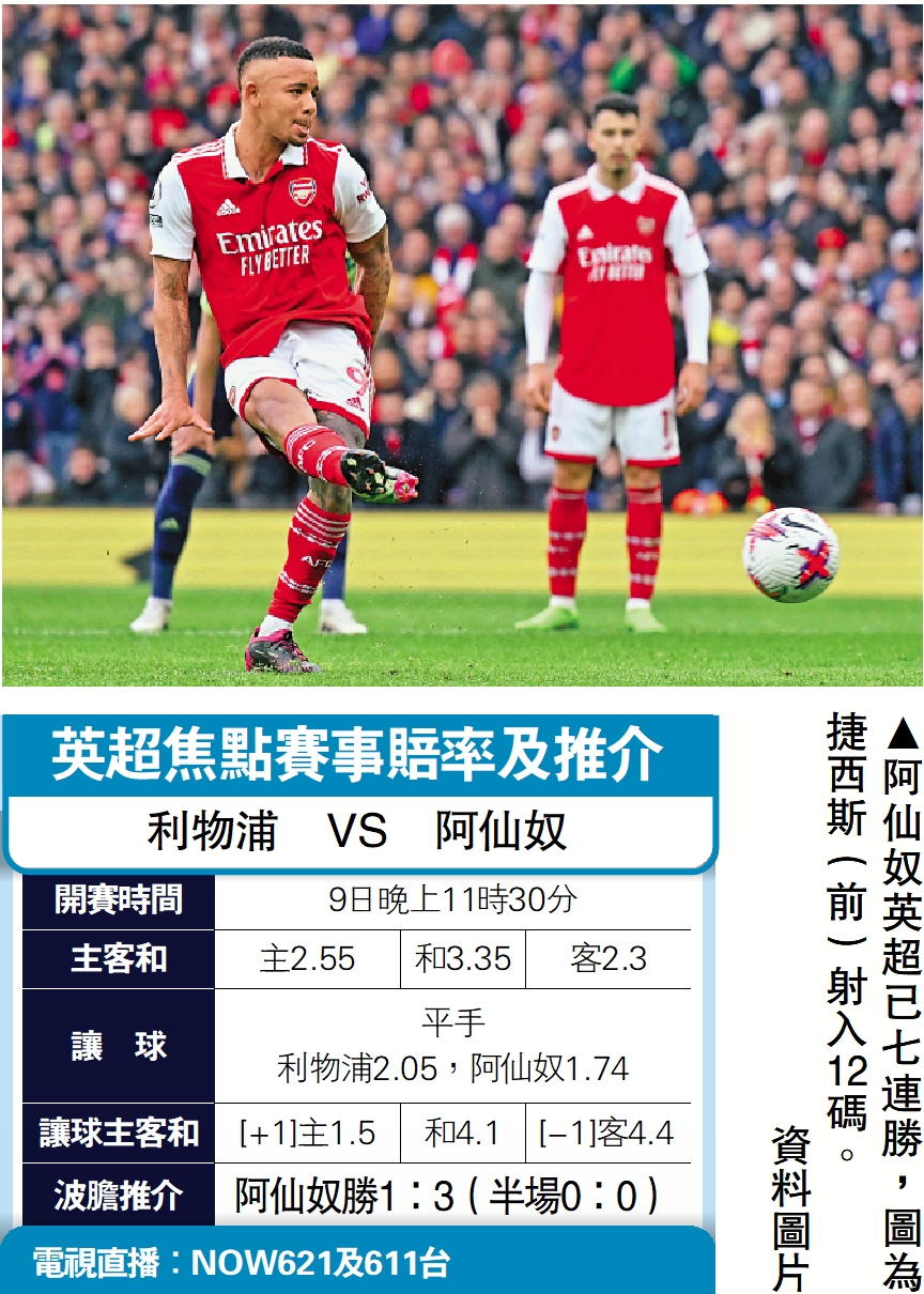 【大公報訊】綜合ESPN FC、香港賽馬會足智彩報道:力爭英超冠軍的阿仙奴,今晚在英超作客對褪色勁旅利物浦。兩隊今季成績天與地,阿仙奴獨佔榜首,爭冠已進入最後階段,未來每場賽事都不容有失,面對頹勢利物浦自然以3分為目標;後者近4場不勝,完全沒有入球能力,讓球開平手下,投注阿仙奴更好。(NOW621及611台今晚11時30分直播)