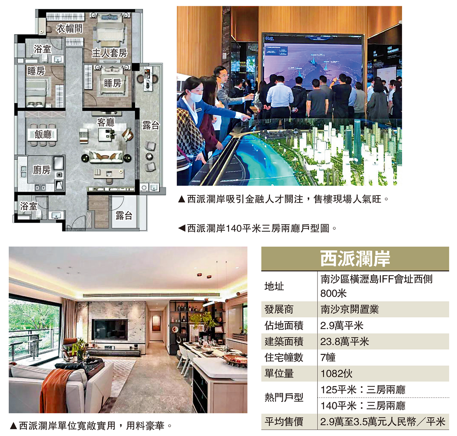 西派瀾岸位於明珠灣內以「全國首個國際金融島」定位的橫瀝島,面積200平米以上的大戶型去年12月開售當日一舉售罄,至今已連續3個月雄霸南沙金融島高端市場榜首。近期西派瀾岸加推125至140平米單位,銷售人員表示,加推的3號樓佔據社區景觀中軸位置,不僅直向中庭景觀,兼享南面江景視野,採光及通風效果俱佳。