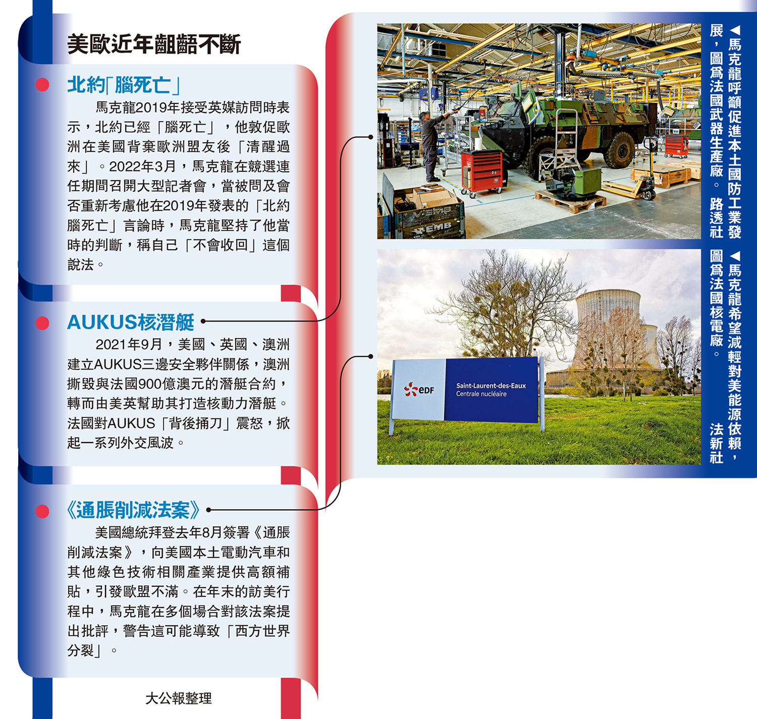 美國總統拜登去年8月簽署《通脹削減法案》,向美國本土電動汽車和其他綠色技術相關產業提供高額補貼,引發歐盟不滿。在年末的訪美行程中,馬克龍在多個場合對該法案提出批評,警告這可能導致「西方世界分裂」。