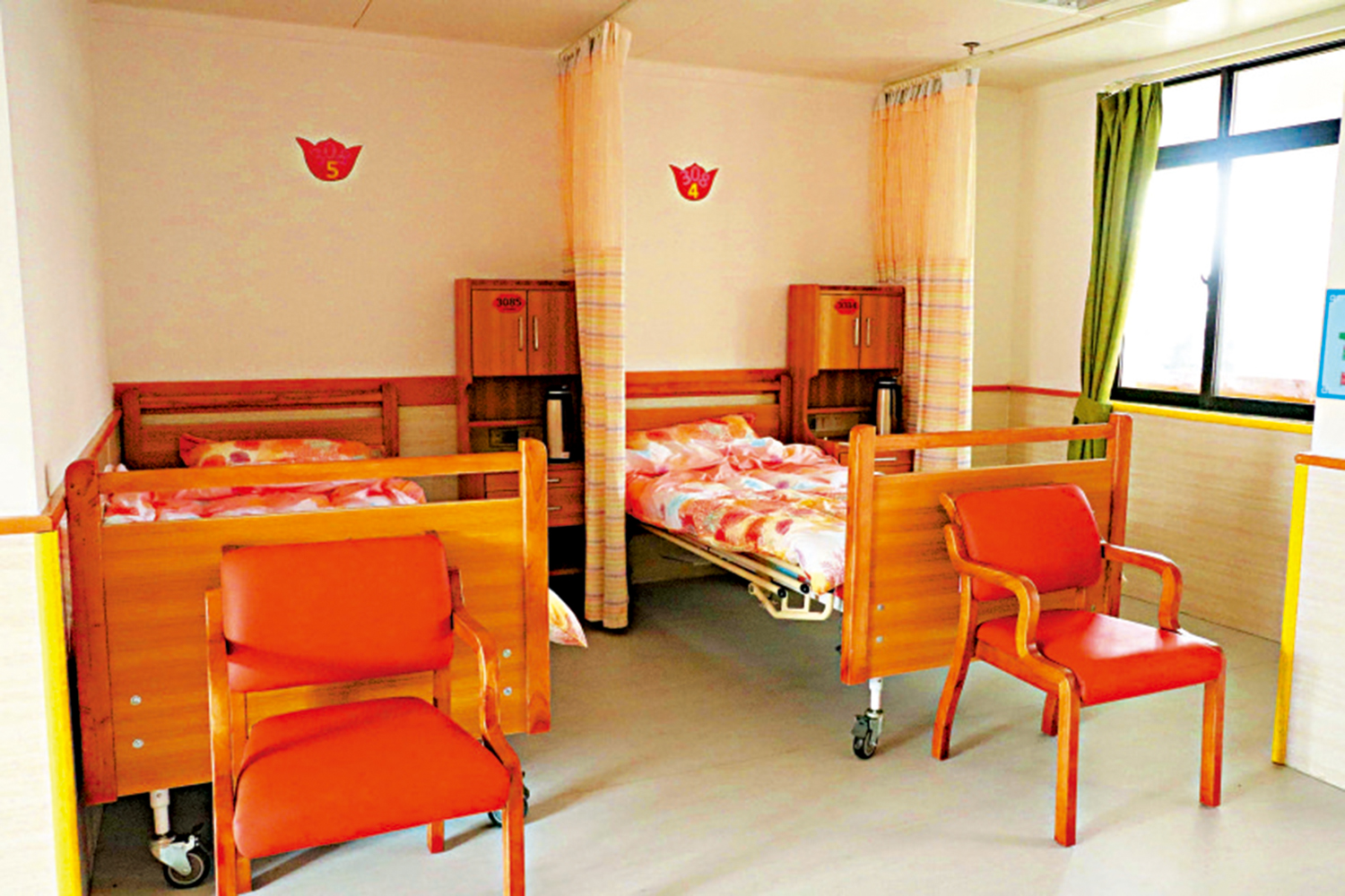 房間介紹:主要設雙人間及五人間,房間內配套有獨立洗手間、熱水器、空調、電視、呼叫系統、無障礙適老化傢具等。