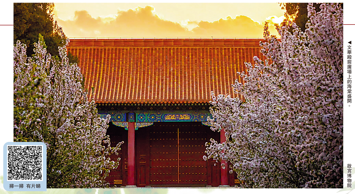 四月初是海棠的季節。故宮種有海棠花的地方不少,但尤以文華殿前廣場上的海棠花最為集中。「繁枝容易紛紛落,嫩蕊商量細細開」,文華殿的海棠卻不在乎,開滿繁枝的大片海棠燦若雲霞,將此處變成花的海洋,春風拂過,便飄起陣陣海棠花雨。「快看這裏!」在海棠亂紅紛飛之際,穿着清宮服飾的「皇后」「格格」忙被攝像師喊着擺出各種姿勢,留下中意的花下照片。