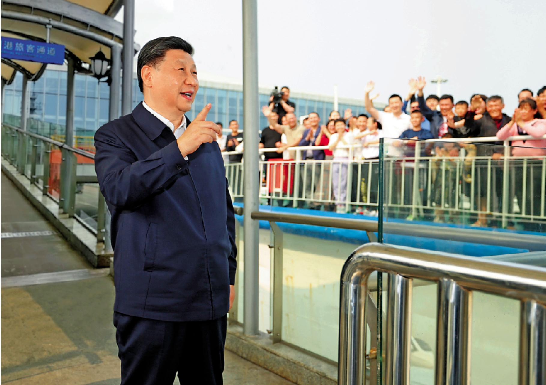 穿過廊橋,總書記來到一艘即將出發的客輪旁。船上的旅客看見總書記來了,高聲向總書記問好。
