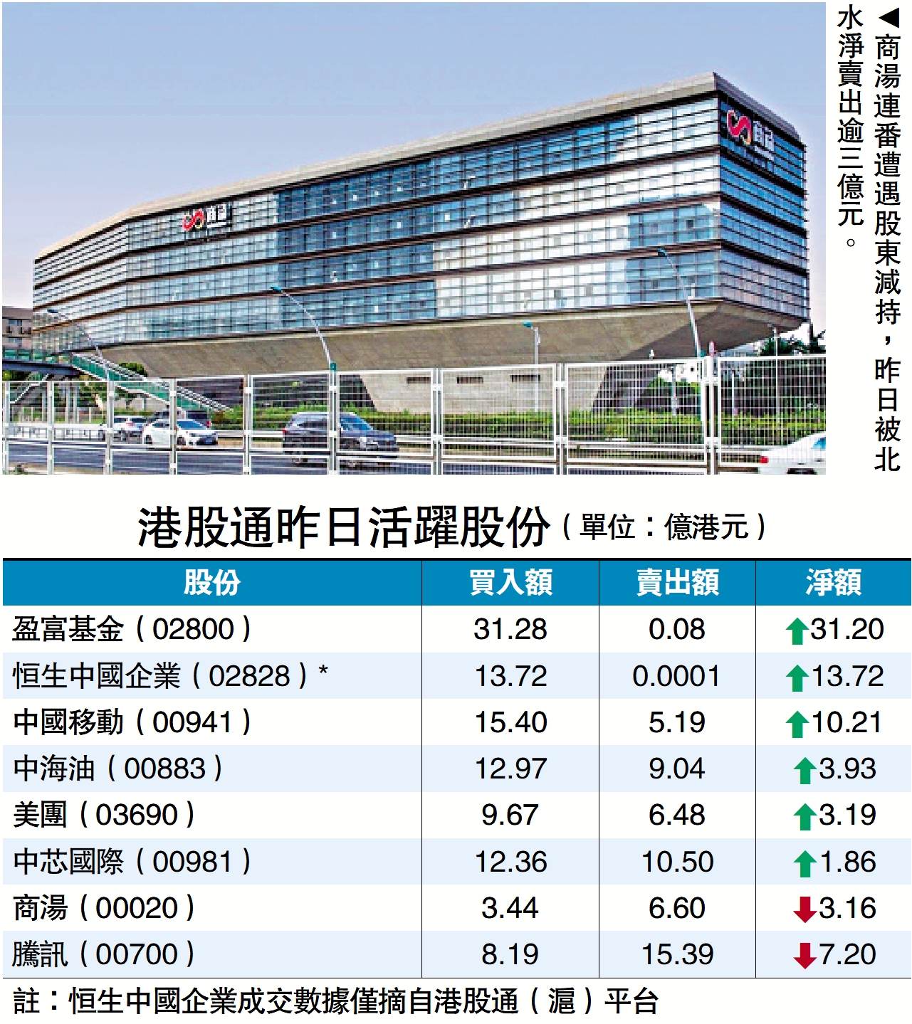 盈富基金(02800)吸金能力超強,昨日南下資金買入31.2億元,賣出883萬元,扣減賣盤後,淨買入盈富基金31.2億元。恒生中國企業(02828)方面,由於港股通(深)未有數據,僅參考港股通(滬),南下資金買入13.7億元恒生中國企業ETF,賣出額只有1.4萬元;扣減賣出額後,全日淨買入金額達13.7億元。