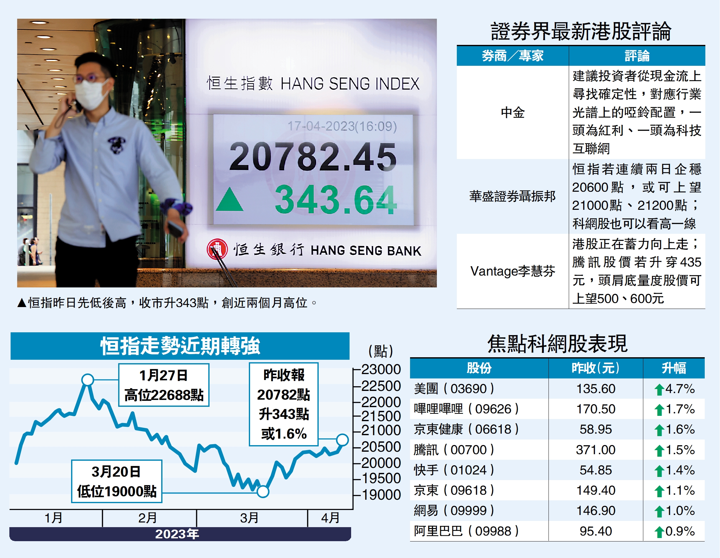 內地A股4月至今持續轉強,延續上周五升勢,昨日再升超過1%。內地投資氣氛轉好,港股投資者亦不敢造淡。恒指早段曾跌139點,但大市很快收復失地,收市時升343點,收報20782點,連續第二天企穩在50天移動平均線,並觸及保力加通道頂部。科技指數全日升89點,收報4254點。主板成交額1365億元,較上日增加26%。