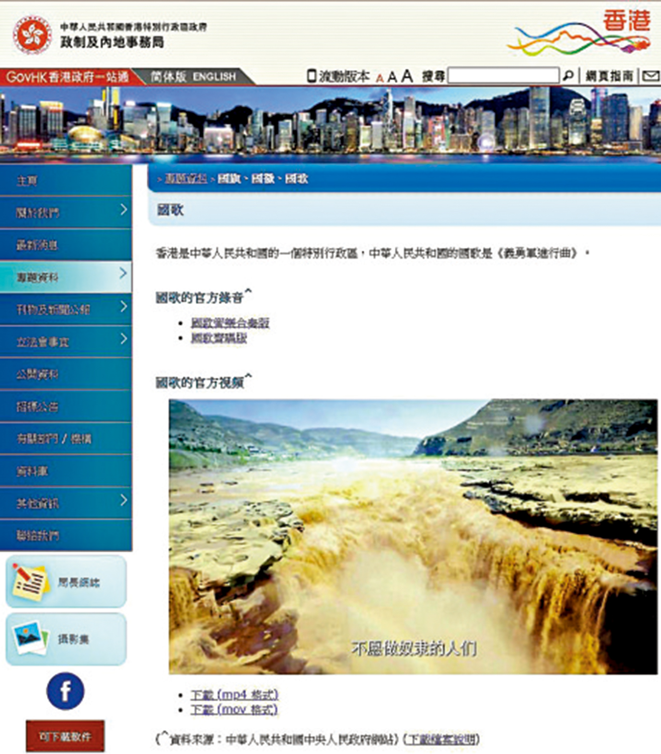 【大公報訊】政制及內地事務局17日更新國歌網頁(見圖),現時國歌頁面的中、英文版本,均直接提供國歌檔案供下載,不再連結至中央人民政府門戶網站的簡體頁面,方便不懂中文人士使用。
