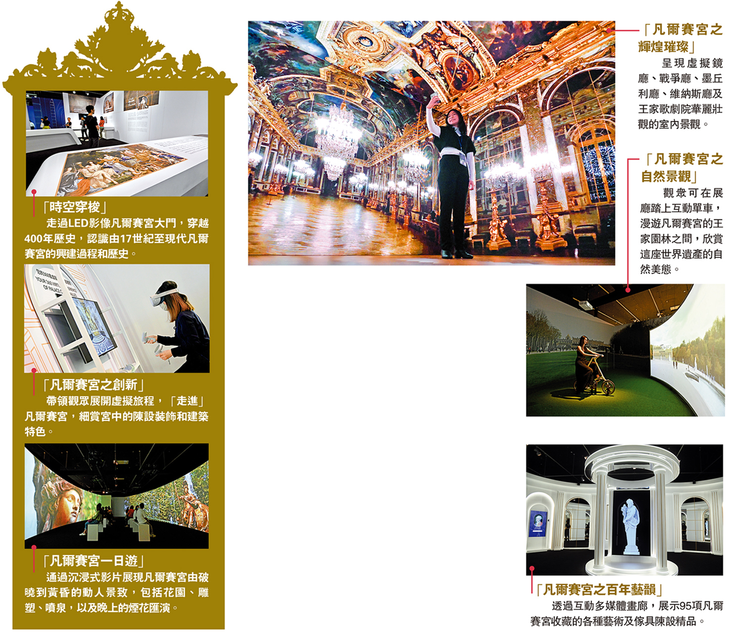 該展覽是全球首個介紹世界文化遺產凡爾賽宮的沉浸式虛擬展覽。「凡爾賽宮之輝煌璀璨」展區以360度全景映像呈現凡爾賽宮最著名的宮室包括:鏡廳、王家歌劇院、戰爭廳、墨丘利廳和維納斯廳,讓觀眾身臨其境,體驗王室氣派。「凡爾賽宮之百年藝韻」展區透過互動多媒體畫廊,展示95項凡爾賽宮收藏中的各類珍藏與經典作品。「凡爾賽宮之自然景觀」展區以自行車互動裝置,帶觀眾漫遊凡爾賽宮的王家庭園,遊覽法式花園、特里亞農宮花園和王后小莊園等。一系列創新的互動裝置,讓觀眾細賞凡爾賽宮的建築工藝和豐富的宮廷珍藏。展區還另設「王室變身區」及「拼圖挑戰」遊戲,讓觀眾搖身一變成為王室名人。