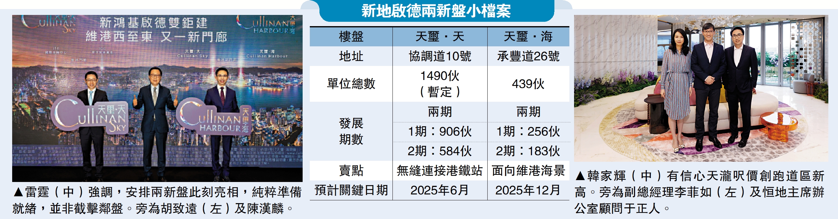 翻查資料,新地分別於2018年5月、2019年1月,以251.61億元及112.6億元,投得天璽·天及天璽·海地皮,每呎樓面地價17776及17360元,前者當時破盡政府賣地紀錄,新地當時估計單是兩個項目的總投資額高達600億元。