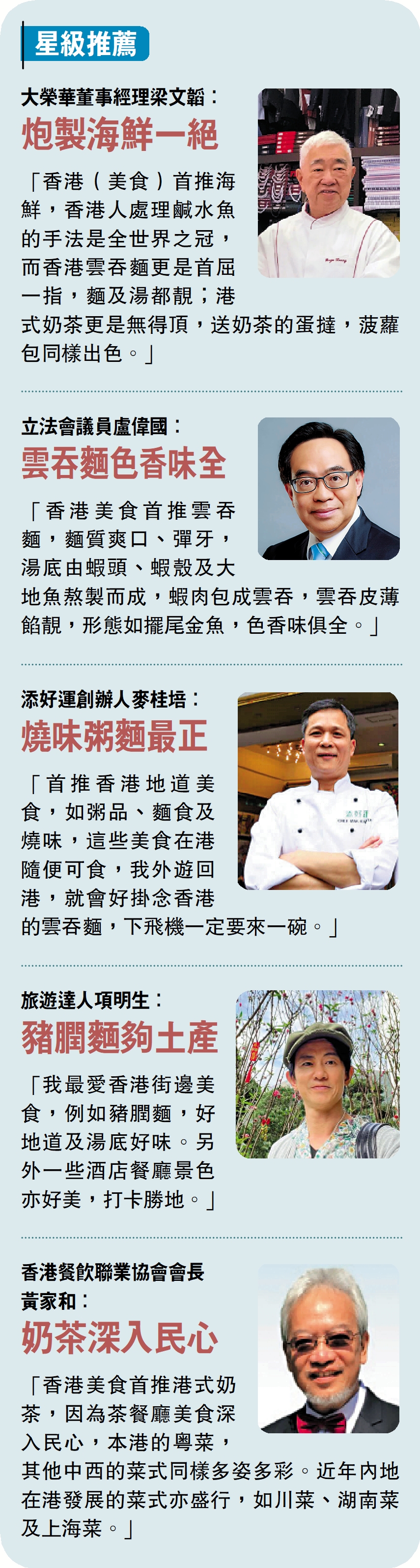 「首推香港地道美食,如粥品、麵食及燒味,這些美食在港隨便可食,我外遊回港,就會好掛念香港的雲吞麵,下飛機一定要來一碗。」