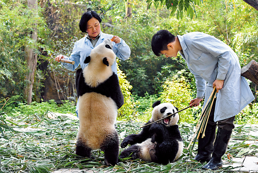 廣州長隆野生動物世界高級保育員、「熊貓媽媽」陳淑青是東北林業大學野生動物保護專業畢業的動物專家,她曾親自守護大熊貓「梅清」產下了首隻華南大熊貓「隆隆」,也是全球唯一大熊貓三胞胎的繁育者。陳淑青說,飼養大熊貓比養育一個孩子都要費勁。例如在動物園裏,遊客經常看到竹子、竹葉被保育員放在樹上,大熊貓要吃上這些東西,就要自己努力攀爬或站起來搖竹竿來獲取。陳淑青說,這是希望通過鍛煉後肢力量為將來配種做準備,而親自設計這些「健身環節」就是保育員的日常工作之一。