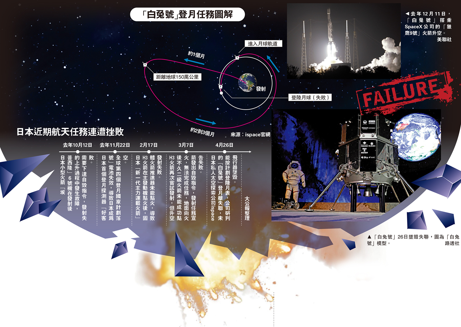 日本希望能在本世紀20年代末,將宇航員送上月球,但該國的太空任務屢戰屢敗。2月17日,日本「新一代主力運載火箭」H3火箭在主發動機點火後,固體火箭推進器未能點火,導致發射失敗;3月7日,H3火箭再次嘗試發射,但升空後不久二級火箭未能成功點火,無法完成任務,地面向火箭發出自毀指令,發射任務宣告失敗。