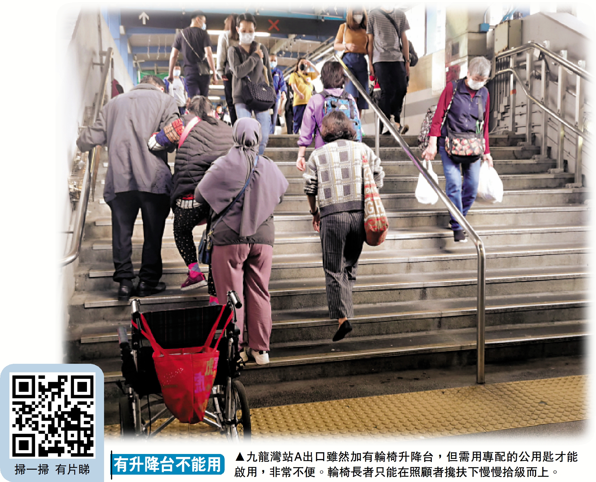 有關部門雖然在A出口的天橋加設了輪椅升降台,惟需用專配的公用匙才能啟用,非常不便。記者日前在中午半小時內,目睹了眾多長者及輪椅人士的不堪和艱難。
