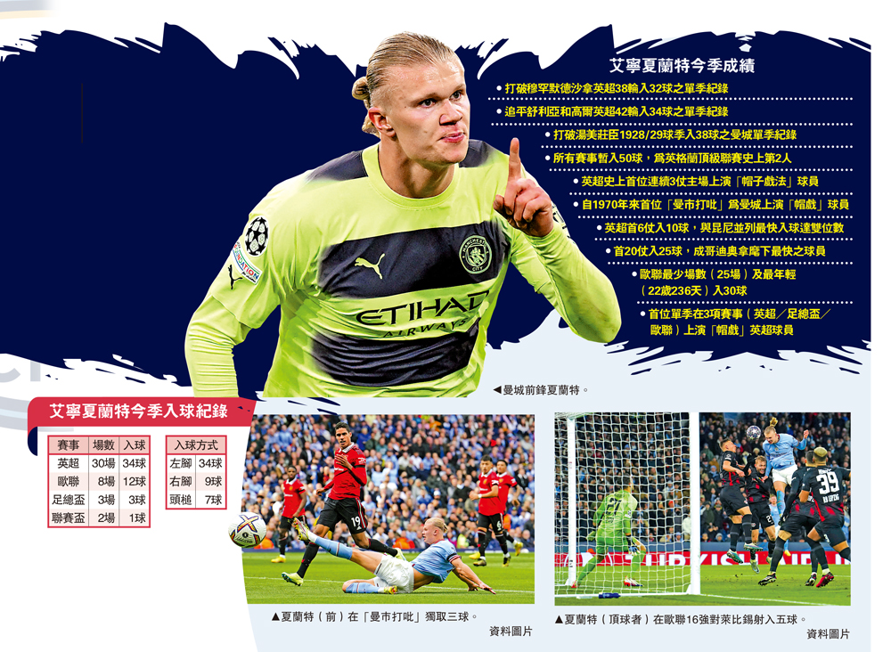 曼城目前衛冕英超形勢一片大好,足總盃下月初與曼市宿敵曼聯爭霸,歐聯亦殺入4強將遇「王上王」皇家馬德里,頗有機會歷史性成為「三冠王」,若最終成功,挪威「外星射手」艾寧夏蘭特毫無疑問是竟全功的最後一塊拼圖;夏蘭特現時已追平英超單季最高入球紀錄,所有賽事總入球亦達半百的50球,餘下還有9至10場比賽,不無機會一舉再攻破封塵接近100年、英格蘭頂級聯賽球員單季總入球達63球的紀錄,實現「入球無極限」。\大公報記者 譚德龍