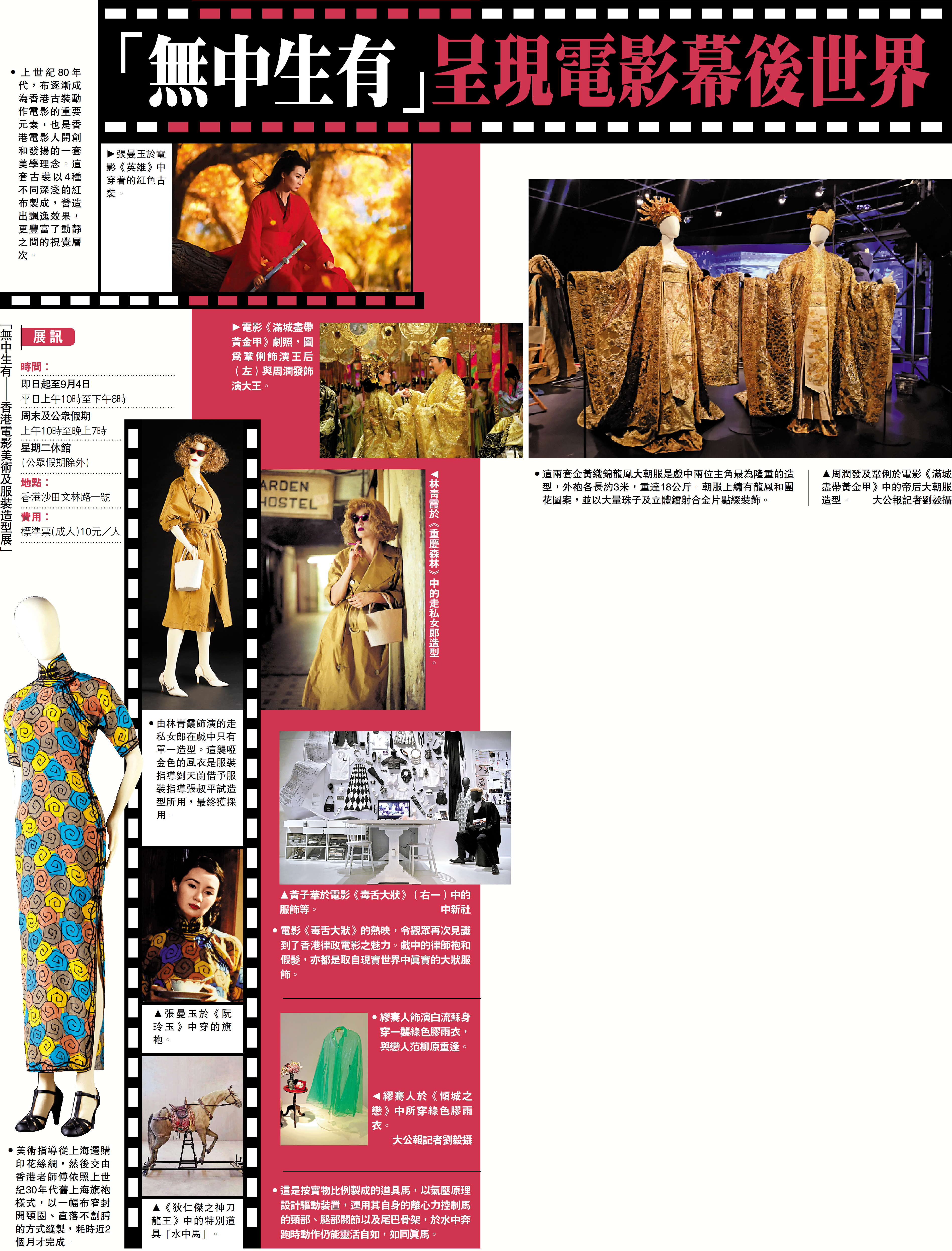 香港的電影藝術舉世矚目,幕後美術團隊和造型指導的付出都相當重要,他們將編導想法化為立體光影,為觀眾打造一個又一個經典電影場景。由康文署及香港電影美術學會聯合主辦、香港文化博物館與香港電影美術學會聯合籌劃的「無中生有─香港電影美術及服裝造型展」,今日起至9月4日在香港文化博物館展出,展品內容豐富,跨度從上世紀60年代至今,涵蓋一系列服飾造型、道具、場景設計等,引領觀眾走入電影幕後世界。\大公報記者 劉毅、劉旅程