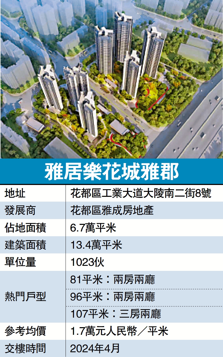 項目佔地6.7萬平米,建築面積13.4萬平米,由7幢27至32層高住宅組成,提供1023個單位。屋苑距離花都湖住宅區約1.5公里,板塊內較為重要的商業配套,包括在建的廣州北站TOD(公共交通導向型開發)項目金地廣場、中旅免稅城,其中,免稅城作為大灣區首個免稅綜合項目,由免稅商城、奧特萊斯商城、一幢辦公樓、兩幢商業塔樓組成。