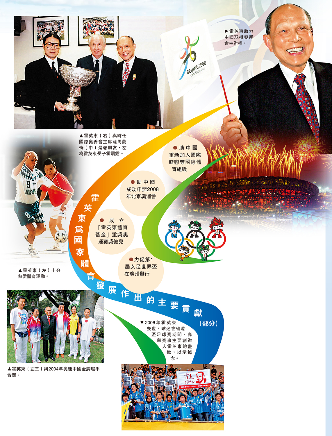 香港著名愛國商人霍英東,一直支持及推動香港乃至國家的體育事業。國家方面,他積極協助中國重返國際體壇;香港方面,他組織足球隊甚至成為香港足球總會會長,也親身參加羽毛球、網球與象棋比賽。多年來為國家及香港投放大量金錢及興建運動設施以支持體育發展,絕對是最出色的「民間體育大使」。\大公報記者 梁潤森