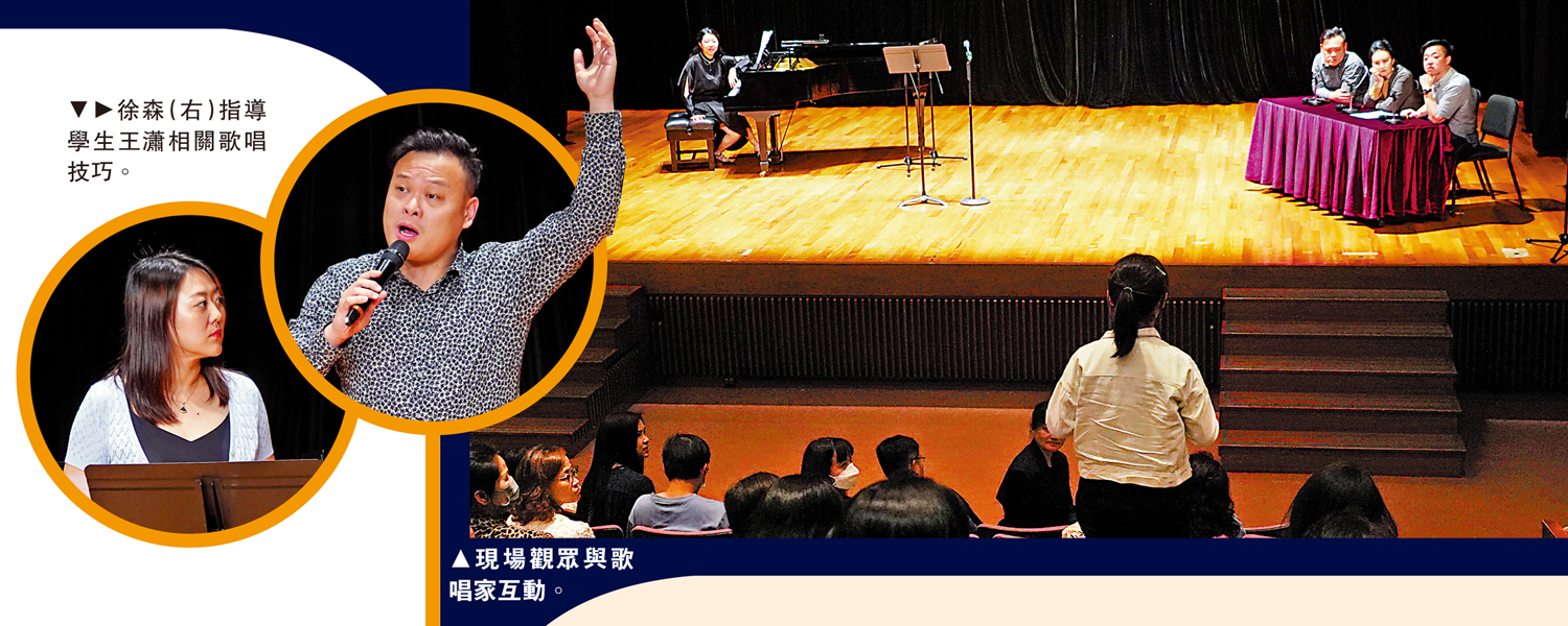 「國風國韻飄香江─中央歌劇院中外經典歌劇選段音樂會」一連兩天在香港上演,深受香港市民喜愛。昨日,中央歌劇院繼續訪港行程,來到香港理工大學蔣震劇院,參加「國風國韻飄香江」系列活動之中央歌劇院音樂大師課「美聲在中外歌曲演唱中的技巧運用」,由女高音歌唱家尤泓斐、男高音歌唱家徐森、李想主講「美聲在中外歌曲演唱中的技巧運用」,親自指導現場一眾表演師生,在演唱美聲時的發音、咬字、作品處理方法等,並提出誠摯中肯的建議,令參與師生受益匪淺。\大公報記者 劉 毅、劉旅程(文) 林良堅(圖)