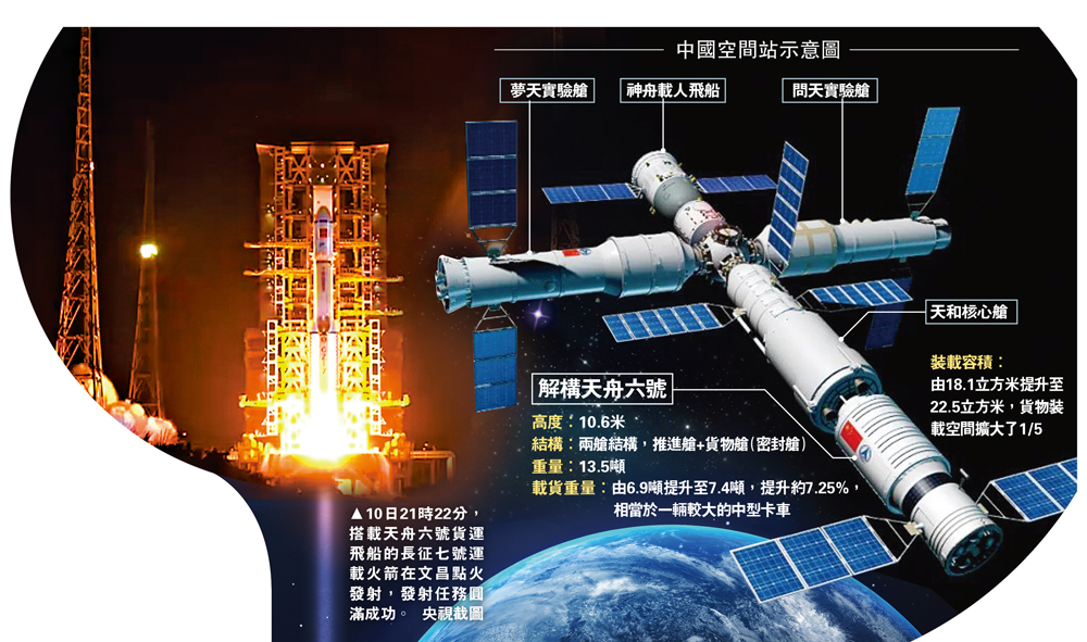 5月10日21時22分,中國空間站應用與發展階段的首次發射任務天舟六號貨運飛船,在長征七號運載火箭托舉下從文昌航天發射場升空,飛往400公里外太空中的空間站。天舟六號是中國改進型貨運飛船的首發船,裝載能力首次突破7噸,攜帶的生活物資可支持3名航天員在軌飛行280天。天舟飛船同時搭載了多項實(試)驗載荷,「抵達」後,兩項圍繞人體幹細胞開展的生命科學實驗將盡快開展,有望在國際上首次實現幹細胞在太空早期造血。\大公報記者 劉凝哲北京報道