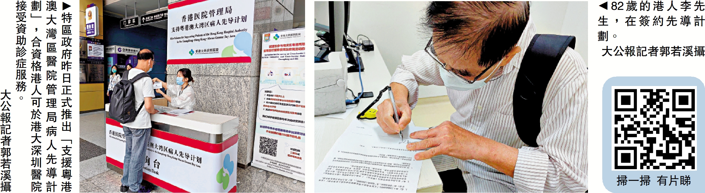 【大公報訊】記者郭若溪深圳報道:香港特區政府昨日正式推出「支援粵港澳大灣區醫院管理局病人先導計劃」,合資格港人可於香港大學深圳醫院接受資助診症服務。昨日共有近50名香港患者簽約,分布在全科及慢病門診、心內科門診、骨科門診等不同的科室。