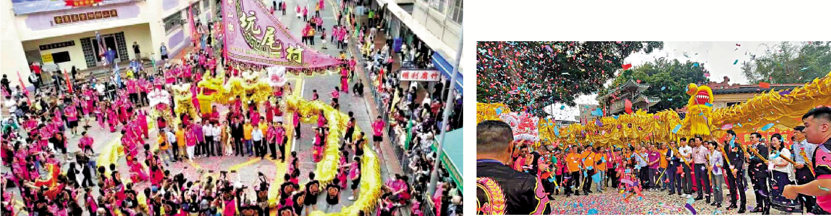 昨日是農曆三月廿三天后誕,本港多區都有慶賀活動。元朗屏山鄉昨日舉辦天后寶誕會景巡遊,現場彩旗飄揚,多個花炮隊伍攜舞龍舞獅參加慶祝,所經街道鑼鼓喧天、喜氣洋洋。不少市民早早在巡遊街道等待,只為一睹巡遊風采,場面異常熱鬧。