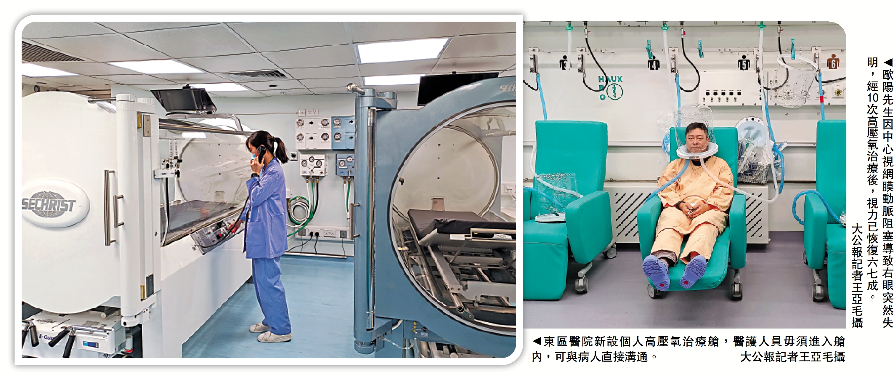 曾接受高壓氧治療的歐陽先生憶述,去年12月底突然右眼失明,診斷是中心視網膜動脈阻塞,當晚獲轉介立即接受高壓氧治療,「整個過程好舒服,不用打任何針和吃藥。」他在首次治療後,已可隱約見到黑白影像,隨後5日內共接受10次治療,右眼視力已從全黑,恢復至能見到模糊的彩色影像,醫生評估其眼內水腫及出血情況已急速減退,他現已恢復六、七成視力。