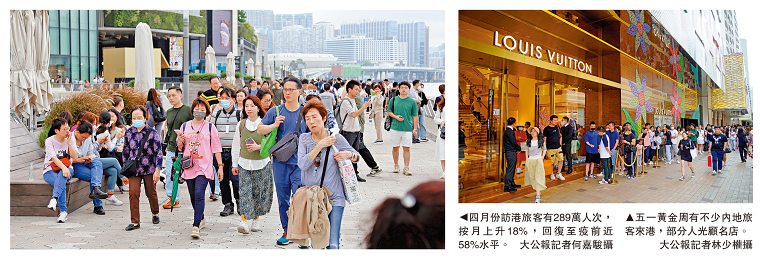 本港旅遊業疫情逐步復常,香港旅遊發展局公布,四月訪港旅客達289萬人次,按月上升18%,回復至疫情前近58%水平,緊接內地五一黃金周,內地旅客增幅顯著。