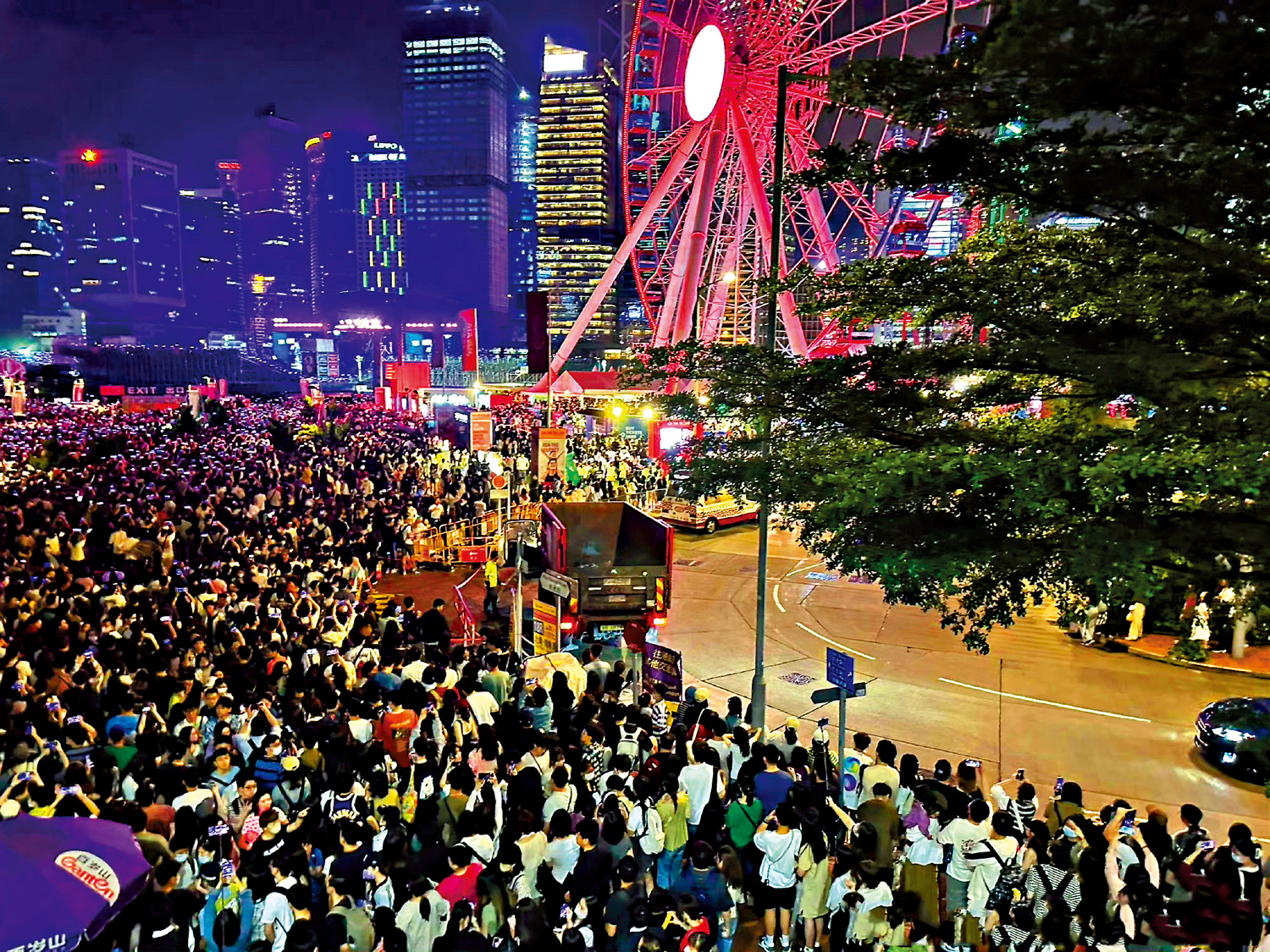 隨着線下演唱會的復常,香港的演唱會也愈見紅火。周日(14日),周杰倫在中環海濱活動空間舉行了「周杰倫嘉年華世界巡迴演唱會2023香港站」的尾場演出,買到票的觀眾滿懷喜悅入場觀看,買不到票的觀眾則在場外以包遊艇、坐摩天輪、於行人天橋「守望」等方式「蹭聽」。對於這種方式,場內觀眾表示可以理解,場外的觀眾則認為雖是一種無奈之舉,也同樣感受到了現場的氣氛,只是需留意安全問題。\大公報記者 劉 毅