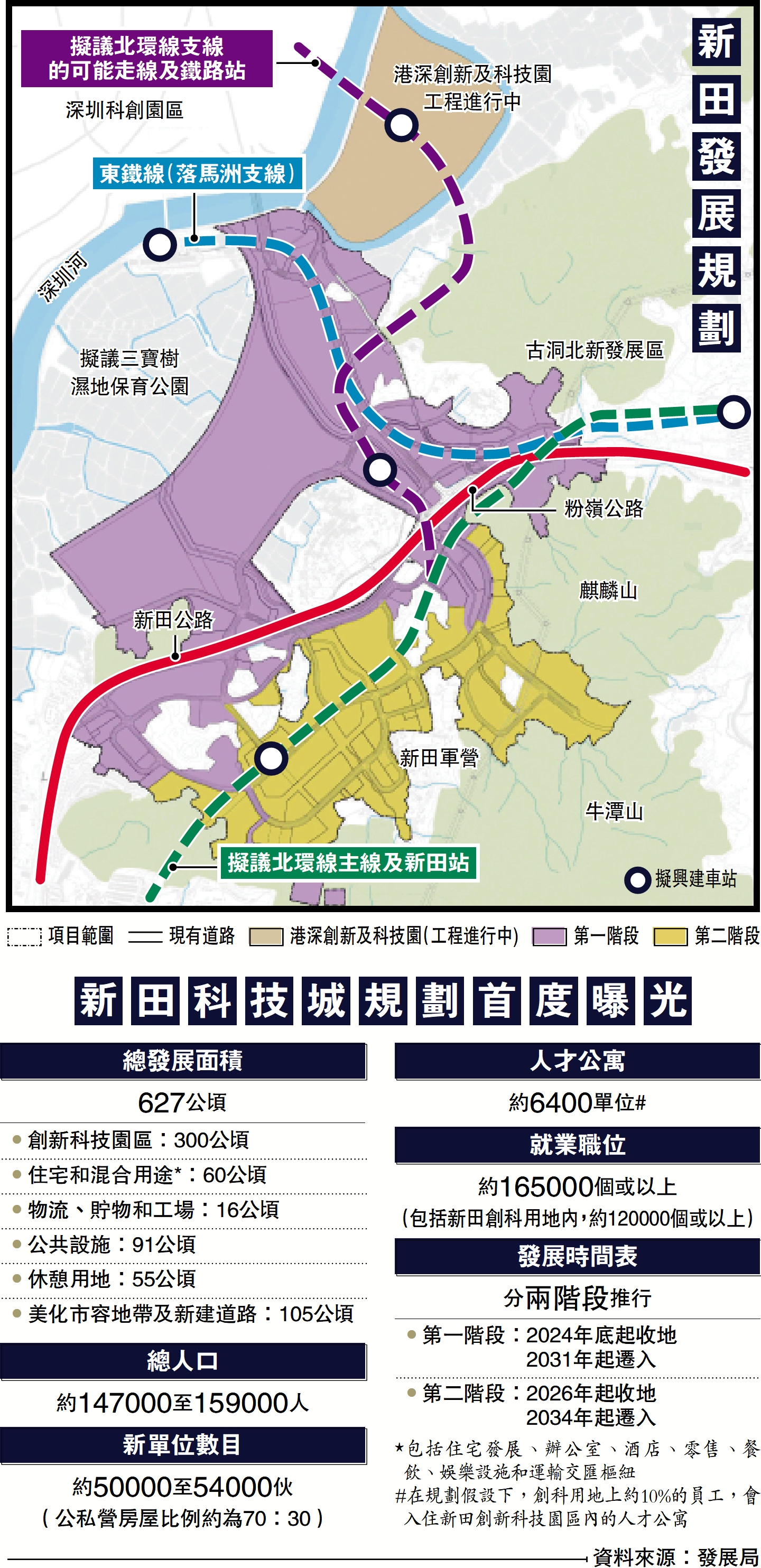 發展局發言人表示,擬議發展的新田科技城,有一半土地為私人用地,即約300公頃,日後將按照新發展區第一級的賠償收地,即每平方呎約1300元,換言之,整個項目收地涉及419.79億元。