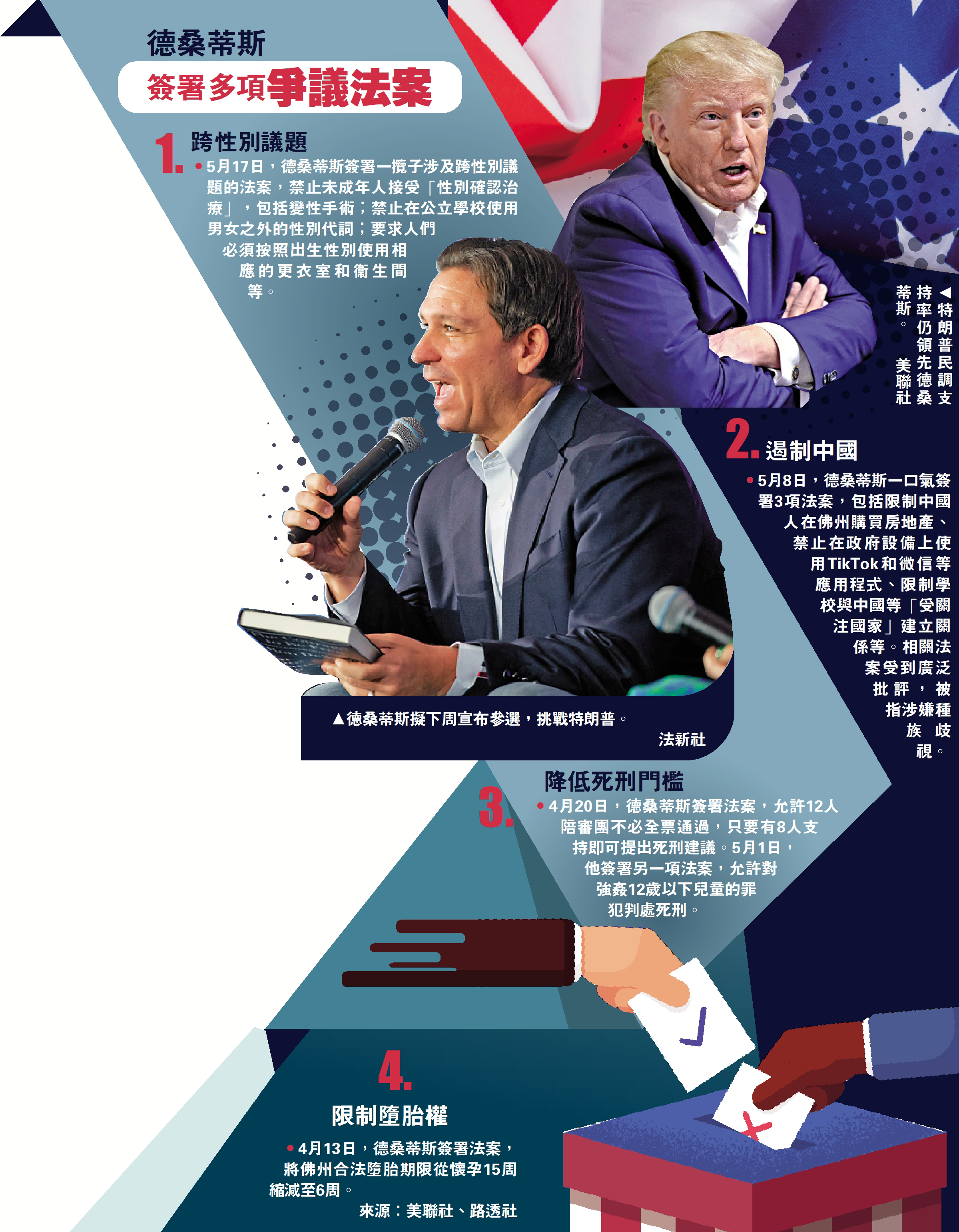 德桑蒂斯近期在佛州推出多項右翼色彩濃厚的法案,包括限制中國人在該州購買房地產、禁止政府設備使用TikTok和微信、降低死刑門檻、進一步限制墮胎權等。17日,他簽署了一攬子涉及跨性別議題的法案,包括禁止未成年人接受變性手術和青春期激素治療、禁止公立學校師生使用男女之外的性別代詞、在政府設施內必須按照出生性別使用相應的更衣室和衞生間等。