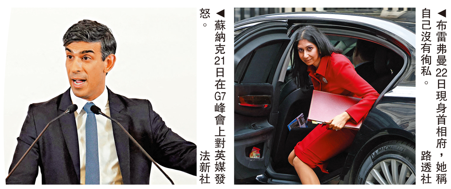 【大公報訊】據路透社報道:英國內政大臣布雷弗曼陷徇私枉法醜聞。首相蘇納克的發言人22日表示,蘇納克正在考慮是否進行正式的道德調查。