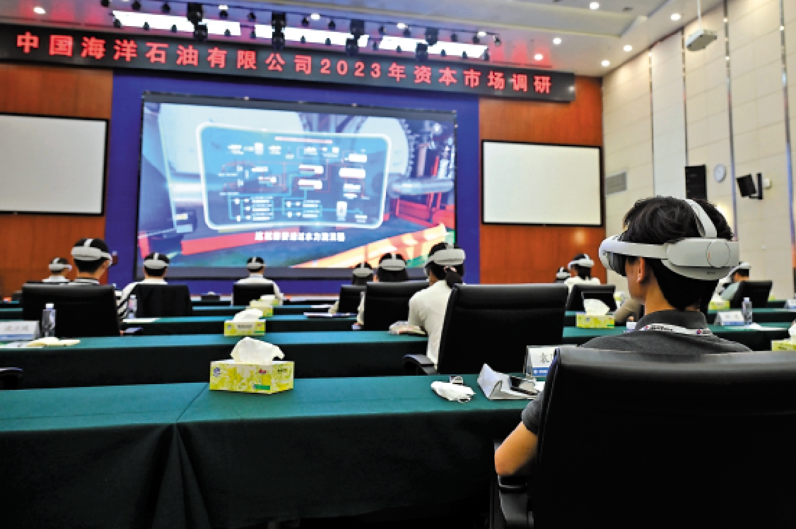 中海油(00883)將海上石油平台的風光透過視頻錄製在VR(虛擬實境)眼鏡中,在戴上眼鏡的一刻,記者彷彿從會議現場穿梭至石油平台上,並跟隨員工的腳步探索這座鋼鐵堡壘,近距離觀察各個模塊。