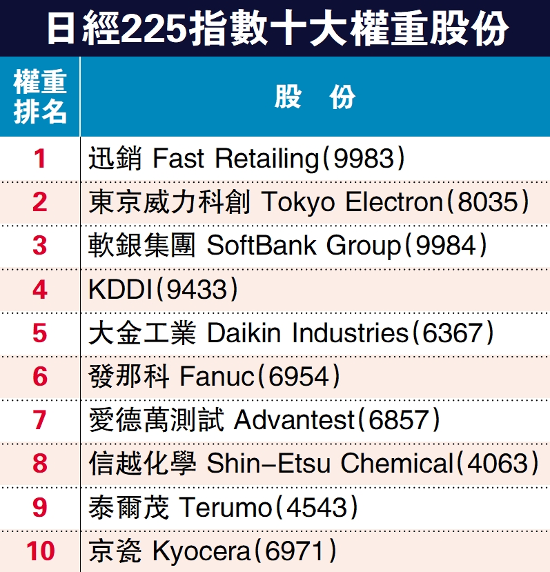 若投資日本股市,建議可先留意一些自己較熟悉的股份,如豐田(7203)、任天堂(7974)、SONY(6758)、軟銀集團(9984)等都是本港投資者耳熟能詳的企業;此外,也可留意日經指數十大權重股份(見附表),這些都是機構投資者愛關注的股份,走勢會比較穩定。