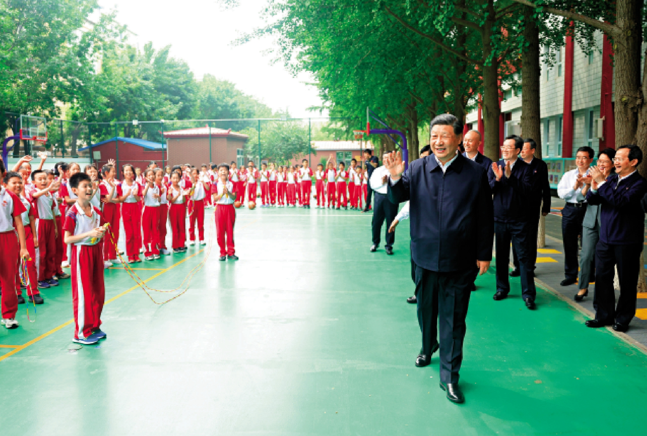 在學校小廣場上,師生們熱情歡送總書記。習近平祝願孩子們茁壯成長、健康成才,並向全國廣大少年兒童祝賀「六一」國際兒童節快樂。他說,今天我專程來北京育英學校看望大家,和小朋友們共慶「六一」兒童節。看到同學們天真活潑、朝氣蓬勃,臉上洋溢着幸福的笑容,感到非常高興。黨中央始終關心關懷少年兒童的健康成長,採取了一系列政策舉措,努力為孩子們健康成長創造更好環境。我相信,有中國共產黨的領導和社會主義制度的顯著優勢,生活在中華民族大家庭裏的各族兒童一定會越來越幸福,一定會擁有更加美好的未來。各級黨委和政府、社會各方面要切實做好與兒童事業發展有關的各項工作,關心幫助困難家庭的孩子特別是孤兒和殘疾兒童,讓所有孩子都能感受到黨和政府的溫暖,都能有一個幸福美好的童年。