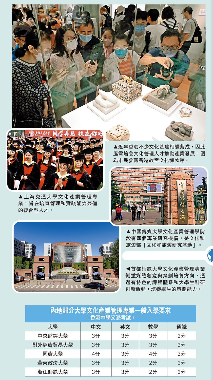 文化藝術對可持續發展、文化多元及全球經濟的貢獻日趨重要,要令文化產業高質量發展,就必須要有卓越的管理人才。近年全球不少大學都紛紛開辦文化產業管理課程,培育有志在此領域發展的年輕人。今期我們介紹內地三所設有文化產業管理的大學,讓同學對此學科有更深入了解。\大公報記者 鍾怡