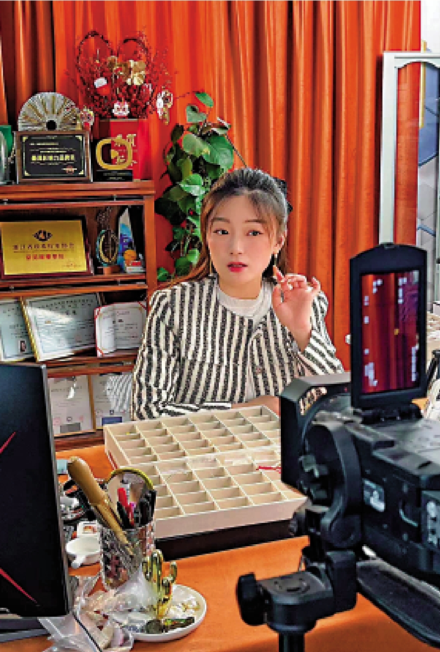 「歡迎寶寶們來到坤坤的直播間,現在給大家上架的是最高品質的麥穗項鏈,僅售680元……」伴隨着激情的叫賣聲,30秒後,上架直播間15條麥穗項鏈被迅速秒空。這樣的叫賣每天都在「90後」林益坤的家裏發生。為了便於直播帶貨,她將自家變成了珠寶直播基地和網店運營發貨中心。林益坤丈夫家裏經營珍珠企業,她則嫁給「珠三代」成為了新一代的珠寶人。依靠年輕人的新思維,她用直播打開了網絡銷售和增收渠道,自創品牌僅用一年時間便以上億元的銷售額追平了父輩經營多年的線下生意。