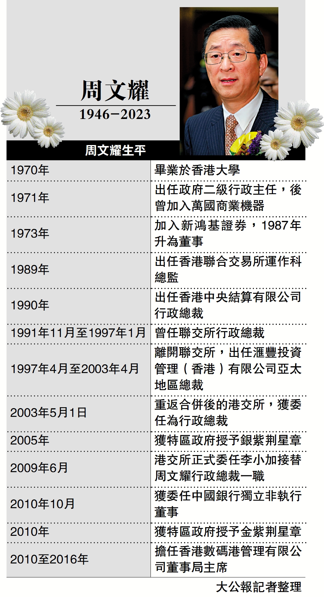 【大公報訊】港交所(00388)前行政總裁、數碼港前主席周文耀離世,享年76歲。周文耀於1989年加入港交所前身聯交所,出任運作科總監,並於1991年至1997年間出任聯交所行政總裁。在聯交所及期交所合併前夕,他轉投滙豐投資亞太(日本除外)地區總裁,並曾任香港投資基金公會主席。