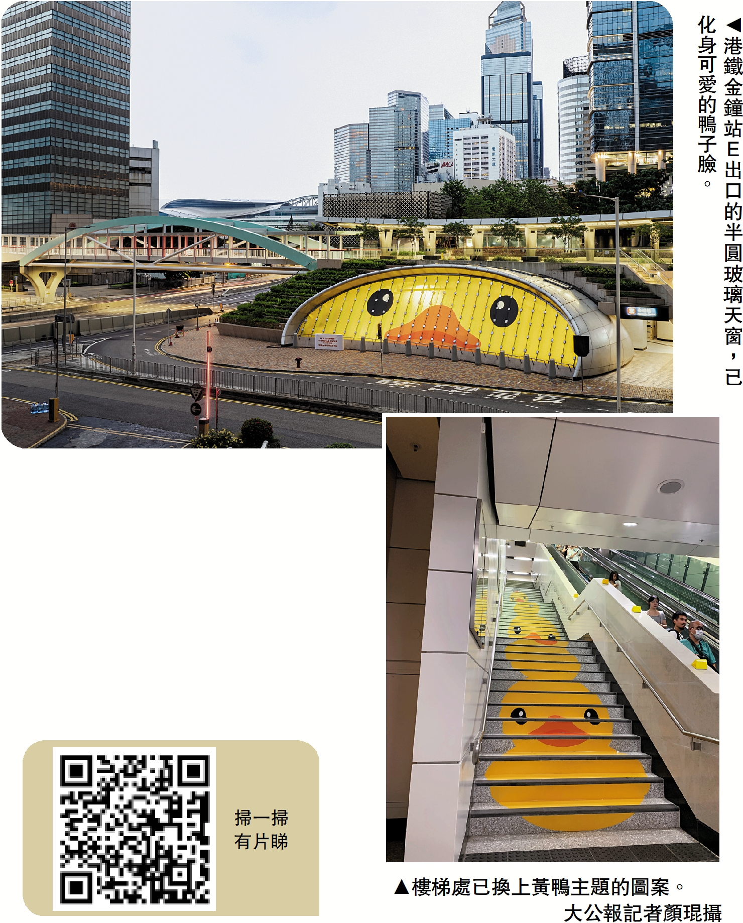 巨型黃色「橡皮鴨」Rubber Duck將於6月10日點亮維港,為了將黃鴨的歡樂帶給乘客,港鐵公司與主辦機構AllRightsReserved合作,即日起將黃鴨的蹤影帶進金鐘站的多個角落。其中,位於金鐘站E出口、高達6米的半圓玻璃天窗最為矚目。未來,黃鴨更會透過港鐵網絡走入社區,以香港特色造型,為乘客帶來一場橡皮鴨港鐵藝術之旅。\大公報記者 顏 琨