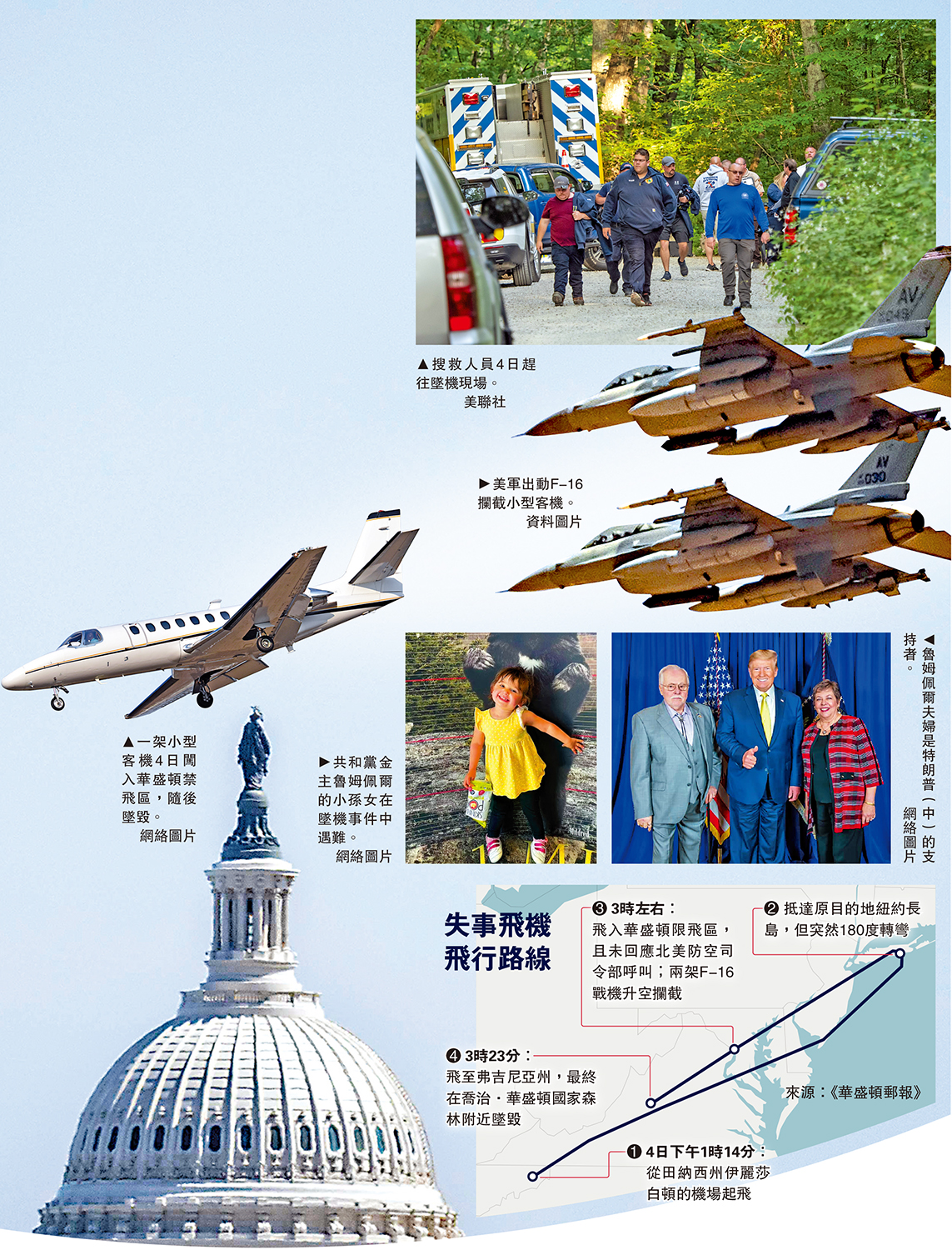 【大公報訊】綜合《紐約時報》、CNN、《每日郵報》報道:當地時間4日下午,一架小型民用飛機闖入美國首都華盛頓禁飛區,導致國會山一度進入「高度警戒」狀態。兩架F-16軍機緊急升空進行攔截,並嘗試與這架小型飛機取得聯繫,但未得到應答。最終,該飛機在弗吉尼亞州山區墜毀,機上4人全部罹難。事故原因正在調查中。美國官員否認F-16導致該飛機墜毀。據報道,死者包括共和黨大金主魯姆佩爾夫婦的女兒和小孫女。