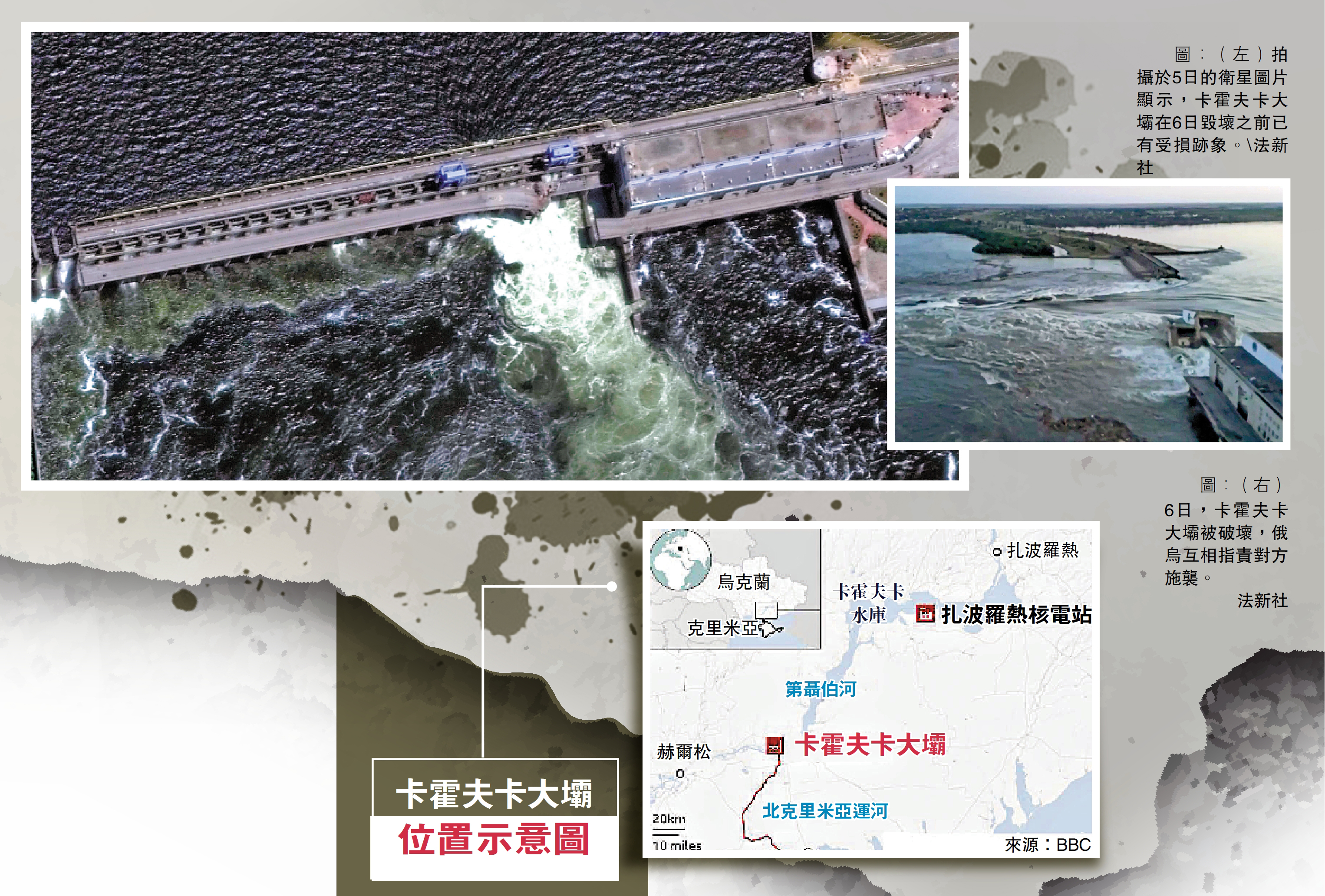 【大公報訊】綜合CNN、塔斯社、美聯社報道:當地時間6日凌晨,烏克蘭南部赫爾松州俄軍控制地區的卡霍夫卡水電站大壩被炸毀,洪水奔流而下,威脅數萬平民。俄烏分別組織各自控制地區的居民撤離,並指控對方襲擊大壩。這座大壩位於第聶伯河上,位置十分關鍵,其水庫為扎波羅熱核電站和克里米亞地區供水。烏方稱,俄軍為了阻止烏軍跨河發動反攻而炸毀大壩。俄方則指責烏方試圖切斷克里米亞供水,並藉此事掩蓋其反攻失利的事實。