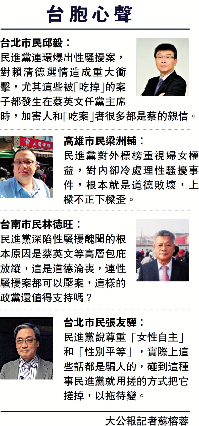 民進黨連環爆出性騷擾案,對賴清德選情造成重大衝擊,尤其這些被「吃掉」的案子都發生在蔡英文任黨主席時,加害人和「吃案」者很多都是蔡的親信。