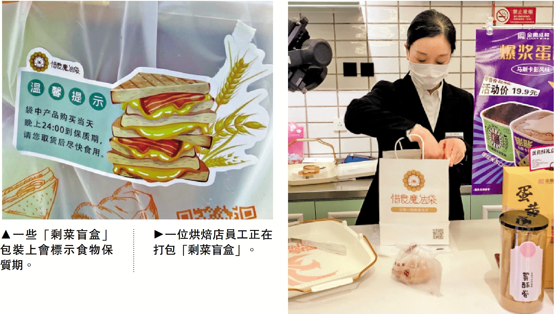 圖左:一些「剩菜盲盒」包裝上會標示食物保質期。圖右:一位烘焙店員工正在打包「剩菜盲盒」。
