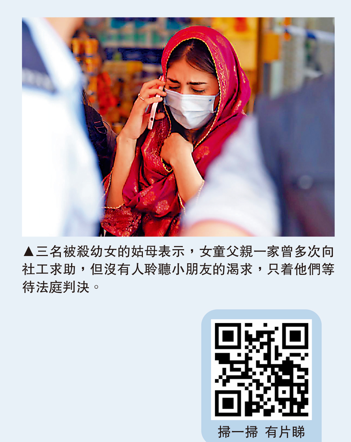 深水埗周一(5日)發生倫常慘案,29歲印度裔母親UR Rehman Aamina涉嫌在家中焗死三名2至5歲女兒。三遇害女童的姑媽向《大公報》親述事件背後的細節,她說,女童父親一家曾多次向社工求助,包括撫養權問題,並稱女童曾向社工哭訴想跟隨爸爸生活,但「no one listen, no one help!」她指無人聆聽小朋友的渴求,只着他們等待法庭判決。而三女的母親過去一年刻意避開父親一家,令父親約一年時間未能與女兒見面。另有報道稱,三童母下毒手是不想三女童交由別的女子照顧,姑媽澄清女童父親沒有外遇,亦不是導致婚姻破裂的原因。